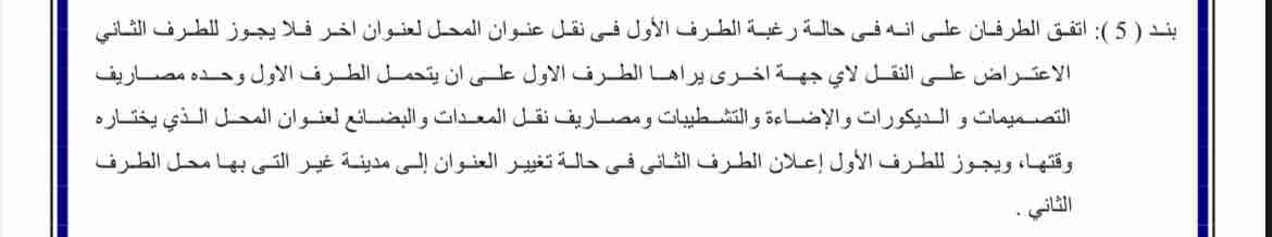 هل هذا البند يعطى الطرف الاول الحق فى نقل المحل الى اى عنوان اخر ( محافظة اخرى ، او منطقة ذات حجم كثافة سكانية و مبيعات قليل) بدون امكانية الاعتراض و الذى قد يخل بمصلحة الطرف الثانى؟