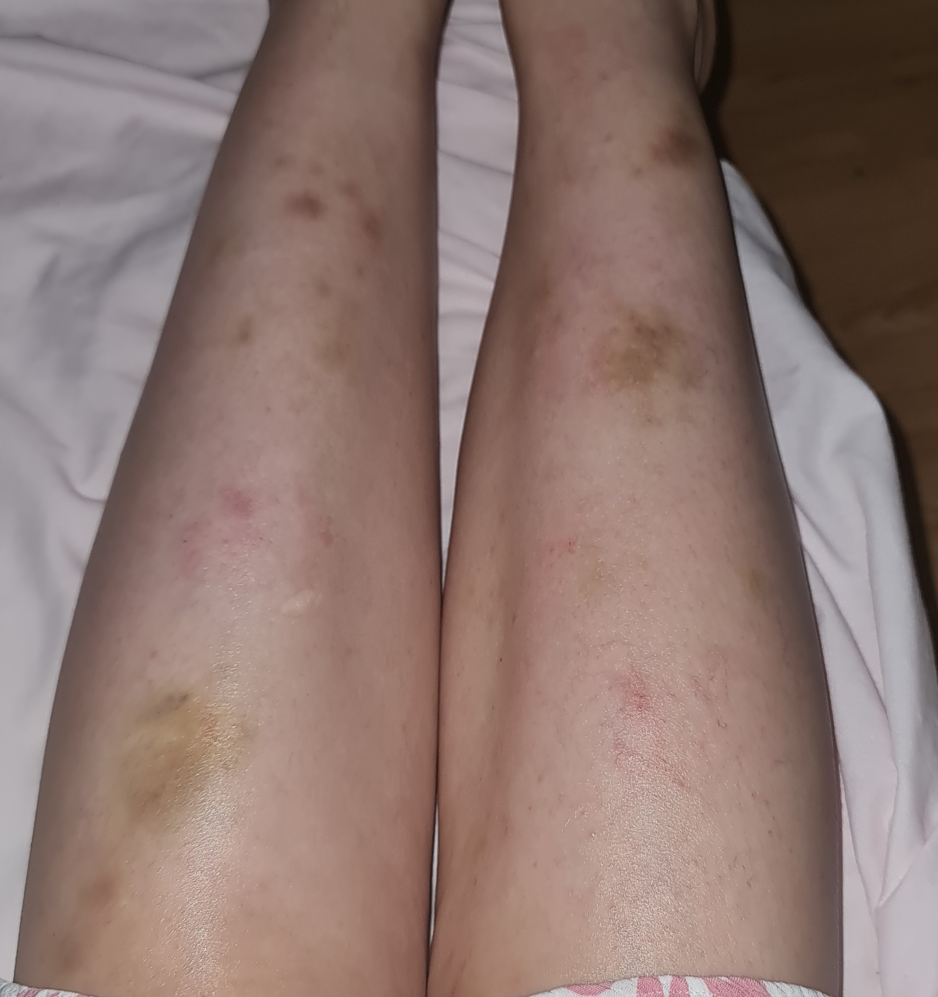 لاول مرة اعاني من الحكة اما بالنسبة للكدمات تظهر وتختفي