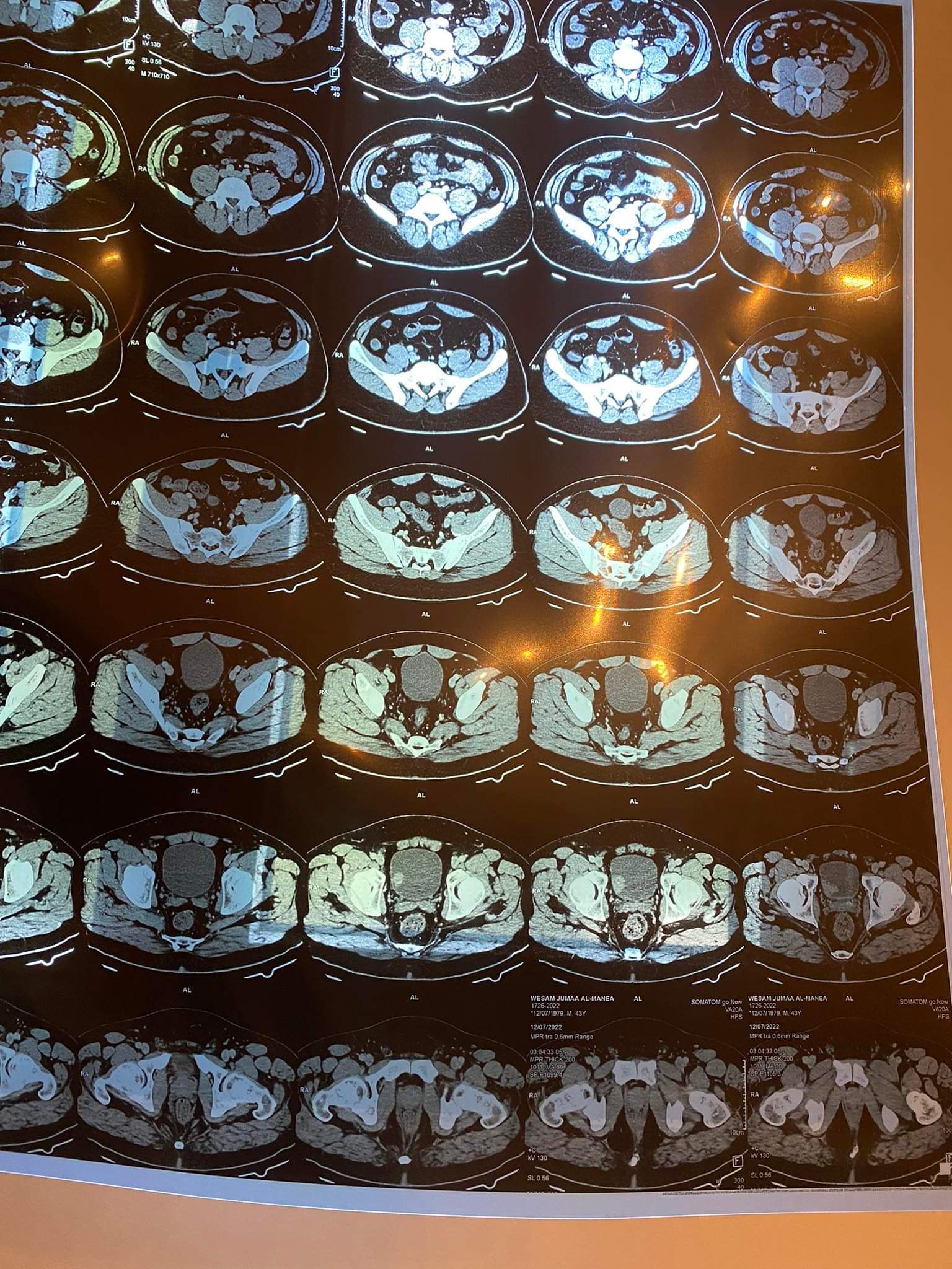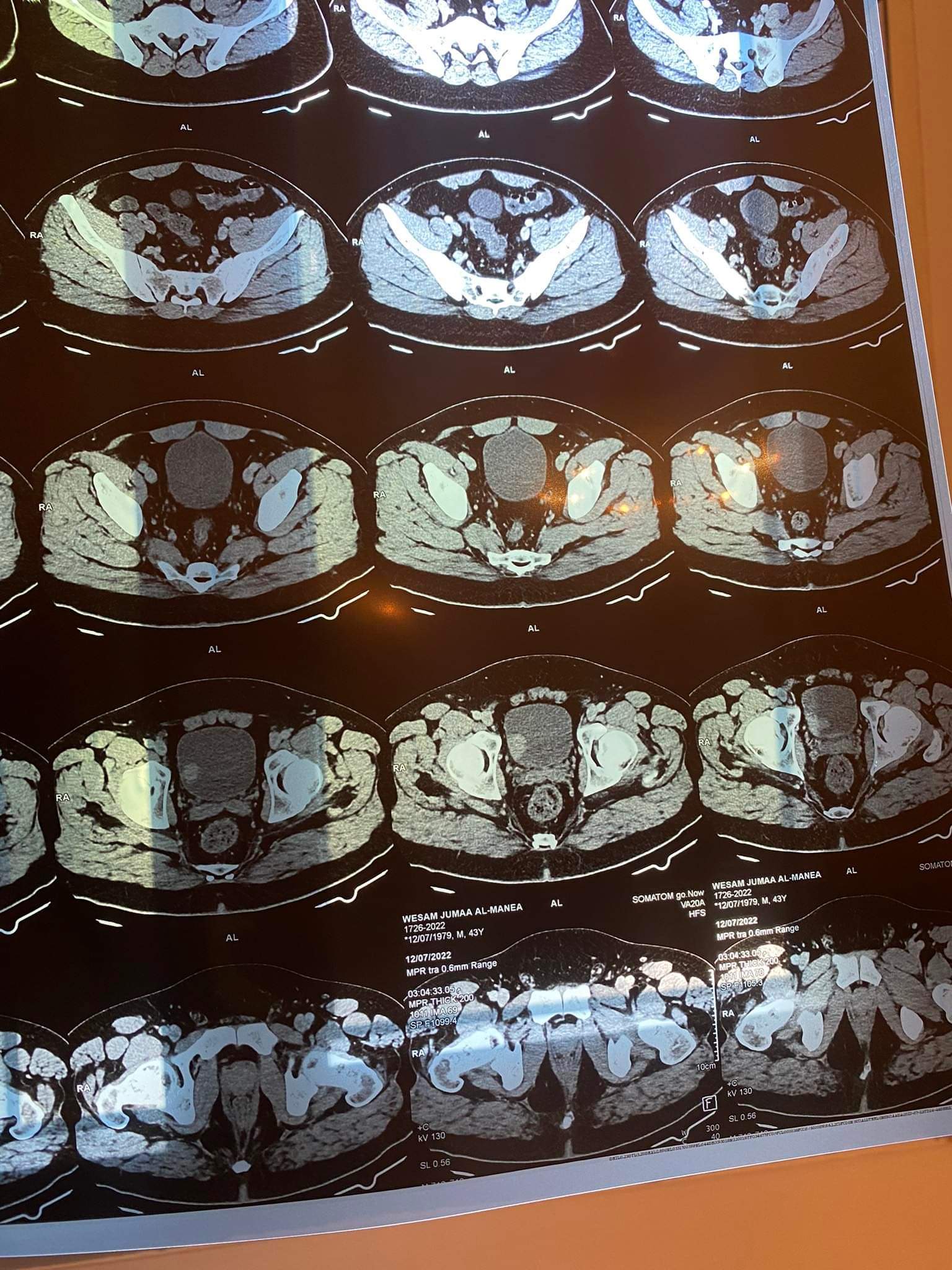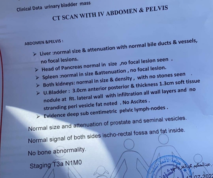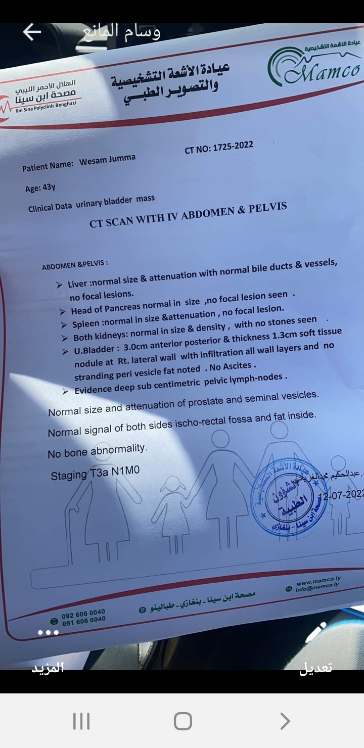 - يشير الفحص الطبي لديكم على وجود ورم في المثانة البولية بحجم 3 سم * 1.3 سم والذي يصل إلى كل الطبقات من المثانة البولية مع وجود عقد ليمفاوية .