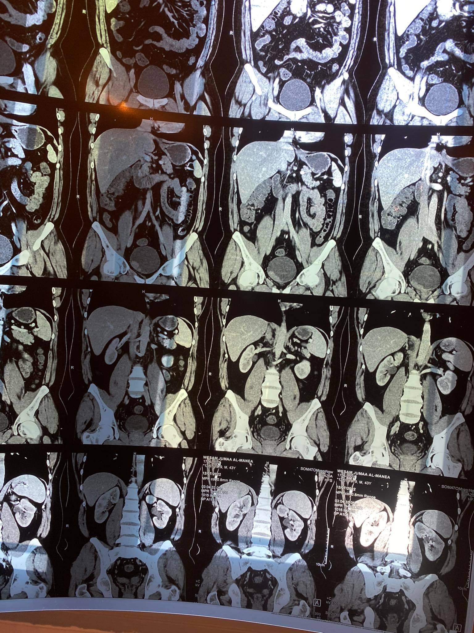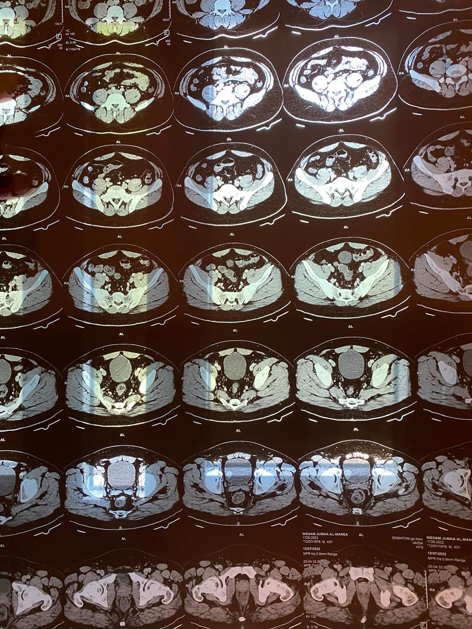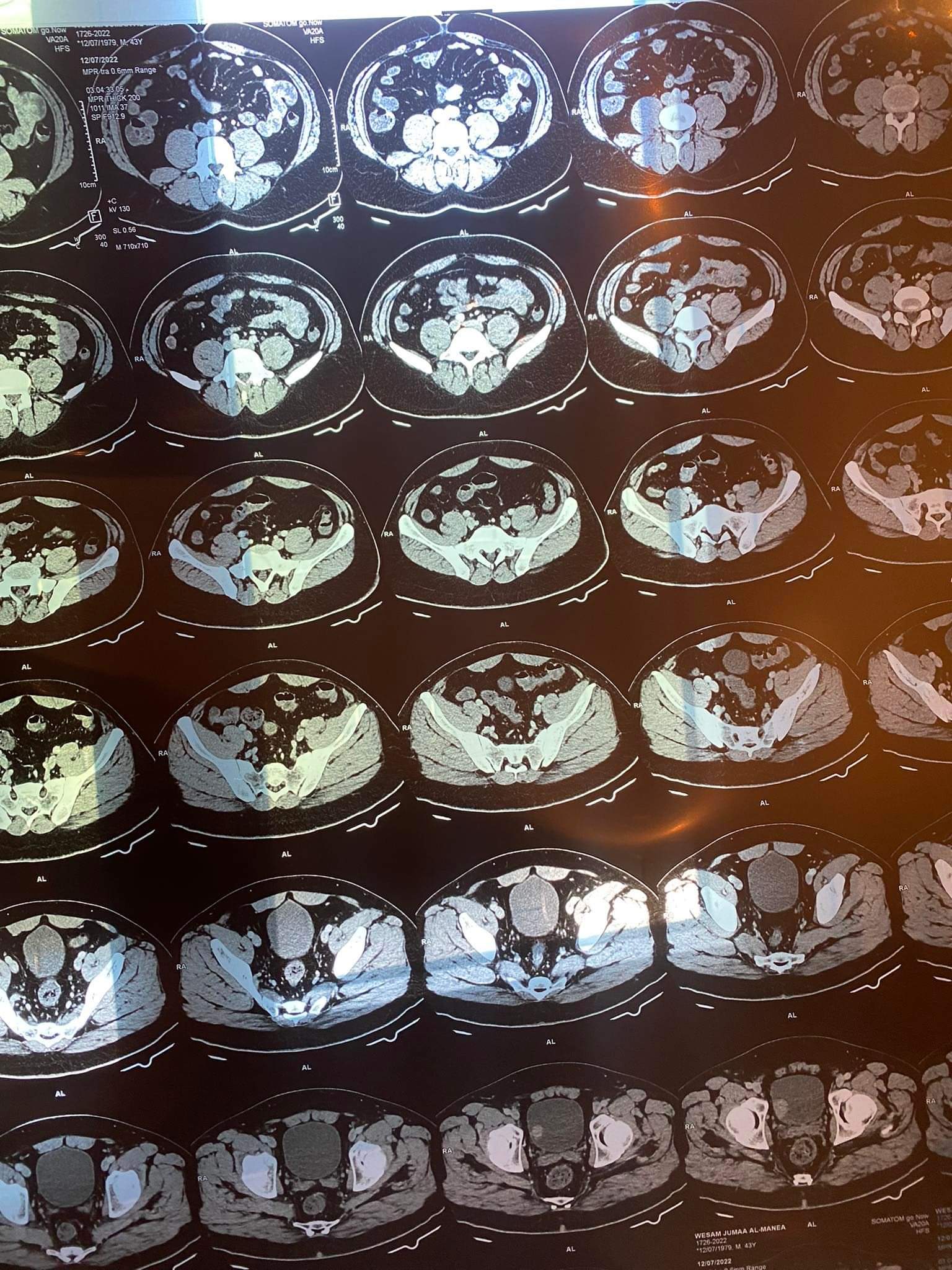 - يشير الفحص الطبي لديكم على وجود ورم في المثانة البولية بحجم 3 سم * 1.3 سم والذي يصل إلى كل الطبقات من المثانة البولية مع وجود عقد ليمفاوية .